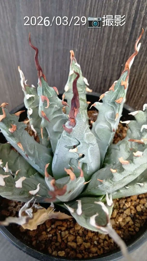 アガベ パープソラム錦 の縦割り子株です。まだ親についたままで未発根となります。購入頂いてから取り外し、第四種便にての発送予定となります。+440円で速達追加致しますので、購入前にコメントからお知らせください。