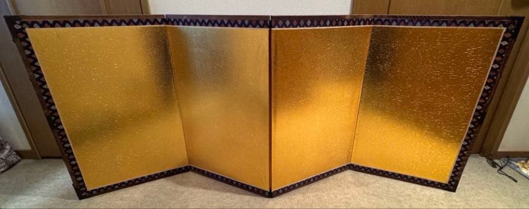 カラー···ゴールド五月人形の特徴···兜飾りの屏風種類···五月人形サイズ縦60cm×横(広げた場合)75cm2枚、箱入り兜飾りの後ろに置く屏風ですが、他の用途にも使用出来ると思います。年数はたってますが、未使用です。多少見落としがあるかも知れません。